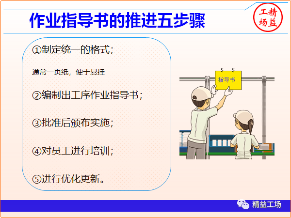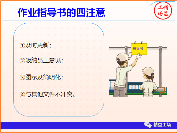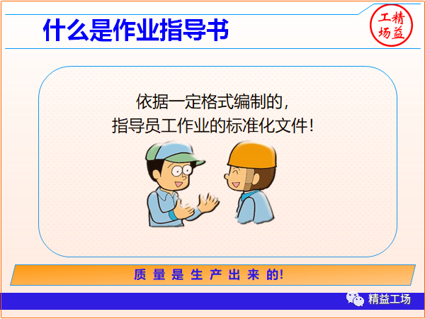 導(dǎo)讀 福特說,標(biāo)準(zhǔn)化是你現(xiàn)在能想到的最佳境界。這句話的意思是說,要將當(dāng)前的最佳作業(yè)方式編制成標(biāo)準(zhǔn),供人們作業(yè)依循,從而大幅提升作業(yè)效率。 這句話有一個(gè)核心,如何才能編制出最佳的作業(yè)標(biāo)準(zhǔn)?如果標(biāo)準(zhǔn)都有問題,不僅不能提升效率,可能還會(huì)有負(fù)面作用。因此,作業(yè)指導(dǎo)書不能僅僅追求“有”,而應(yīng)追求“最優(yōu)”。 所有作業(yè)指導(dǎo)書應(yīng)按統(tǒng)一格式進(jìn)行編制,這是一種規(guī)范。 作業(yè)指導(dǎo)書格式的內(nèi)容包括作業(yè)步驟、作業(yè)要求、圖示以及信息說明。信息說明指闡明這份文件的相關(guān)狀況,如適用產(chǎn)品、工序名稱、版本號(hào)、編寫人、審批人等,明確應(yīng)用場景以及便于追溯。 判斷一份作業(yè)指導(dǎo)書的價(jià)值如何,主要在于其是否將作業(yè)關(guān)鍵點(diǎn)描述清楚。作業(yè)關(guān)鍵點(diǎn)有三個(gè)特征。 關(guān)乎安全:與作業(yè)安全息息相關(guān),如化學(xué)品的使用注意事項(xiàng)。 關(guān)乎成敗:若不按這個(gè)方法,作業(yè)就無法達(dá)成效果。煲雞湯要求三小時(shí)文火,如不按這個(gè)要求,那么煲出的雞湯口感不到位。 使得作業(yè)更容易的方法:按照作業(yè)指導(dǎo)書的要求做,會(huì)更為便捷,或更快。 作業(yè)指導(dǎo)書四注意。 ①及時(shí)更新,昨天的太陽曬不干今天的衣服,作業(yè)指導(dǎo)書要與當(dāng)下的情景相吻合;②吸納員工意見,作業(yè)指導(dǎo)書是給員工用的,自然要吸納員工意見;③圖示與簡明化,讓員工容易理解、易于掌握;④與其他文件不沖突,不同文件應(yīng)協(xié)調(diào)一致,避免歧義的產(chǎn)生。 作業(yè)指導(dǎo)書五步驟。 ①制定統(tǒng)一的格式,通常一頁紙呈現(xiàn)出一道工序的作業(yè)內(nèi)容,便于員工閱讀。 ②編制出工序作業(yè)指導(dǎo)書,即依照格式編制出各個(gè)工序的作業(yè)指導(dǎo)書。 ③批準(zhǔn)后頒布實(shí)施,經(jīng)過一定的批準(zhǔn)流程,確保作業(yè)指導(dǎo)書的嚴(yán)謹(jǐn)性與實(shí)用性。 ④對員工進(jìn)行培訓(xùn),將作業(yè)指導(dǎo)書當(dāng)作“教案”對員工進(jìn)行作業(yè)技能的培訓(xùn)。 ⑤進(jìn)行優(yōu)化更新,對作業(yè)進(jìn)行優(yōu)化,并將優(yōu)化的相關(guān)做法更新至作業(yè)指導(dǎo)書中,以確保其“最優(yōu)”狀態(tài)。 點(diǎn)晴模切ERP更多信息:http://moqie.clicksun.cn,聯(lián)系電話:4001861886 該文章在 2023/6/20 15:07:29 編輯過 |