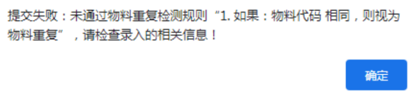 情況描述:編輯物料保存時(shí)彈出提示:“提交失敗未通過(guò)物料重復(fù)檢測(cè)規(guī)則“1.如果物料代碼相同,則視為物料重復(fù)”,請(qǐng)檢查錄入的相關(guān)信息