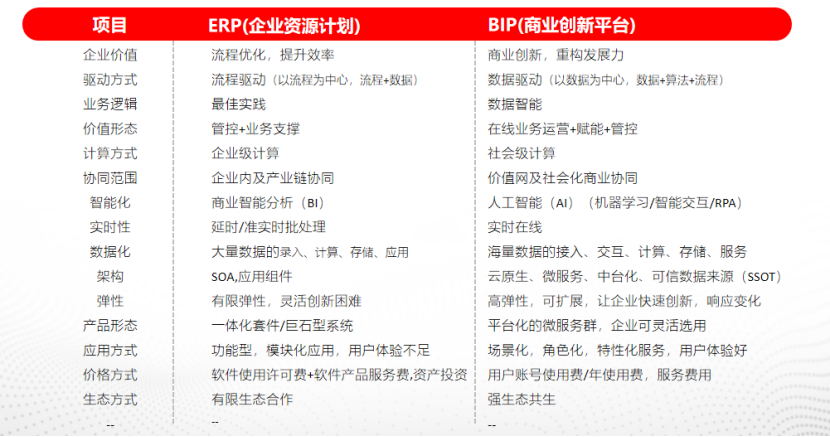 財(cái)務(wù)中臺(tái) 中臺(tái)解釋有點(diǎn)太技術(shù),不妨來(lái)看看財(cái)務(wù)中臺(tái)解釋。 財(cái)務(wù)中臺(tái)是在業(yè)務(wù)系統(tǒng)和財(cái)務(wù)核算系統(tǒng)之間做一個(gè)橋梁,通過(guò)萃取財(cái)務(wù)標(biāo)準(zhǔn)化公共能力,連接所有與財(cái)務(wù)相關(guān)的業(yè)務(wù)、財(cái)務(wù)、稅務(wù)、資金、預(yù)算等數(shù)據(jù),進(jìn)行篩選、加工(人工或系統(tǒng)規(guī)則)、轉(zhuǎn)換,再將轉(zhuǎn)換后的數(shù)據(jù)提供給財(cái)務(wù)核算與數(shù)據(jù)服務(wù)系統(tǒng),從而轉(zhuǎn)變?yōu)閷?shí)現(xiàn)核心財(cái)務(wù)能力復(fù)用的新的財(cái)務(wù)模式。 中臺(tái)講了很多年,最火的時(shí)候莫過(guò)于阿里建中臺(tái)那段時(shí)間。大潮褪去隨著實(shí)踐的驗(yàn)證,企業(yè)也逐漸開始有所取舍,開始思考要不要做中臺(tái),自己適合不適合等問(wèn)題,而不是一股熱腦上中臺(tái);另外隨著技術(shù)的進(jìn)步,一些B端廠商已經(jīng)逐漸開始把中臺(tái)的理念融入產(chǎn)品為企業(yè)提供服務(wù)。終于搞明白中臺(tái)是什么了?三句話做概括 7. 新一代ERP 新的經(jīng)濟(jì)形勢(shì)對(duì)企業(yè)管理提出了新的要求,傳統(tǒng)的ERP技術(shù)在新形勢(shì)下暴露出數(shù)據(jù)標(biāo)準(zhǔn)不統(tǒng)一、升級(jí)換代成本高、外部協(xié)同性差等問(wèn)題。新一代ERP運(yùn)用最新的信息技術(shù)手段,以微服務(wù)架構(gòu)開發(fā)、用數(shù)據(jù)湖存儲(chǔ)、依云平臺(tái)部署,既克服了傳統(tǒng)ERP系統(tǒng)的弊端,也為ERP系統(tǒng)的進(jìn)一步發(fā)展提供了充足動(dòng)力。(摘自《財(cái)務(wù)與會(huì)計(jì)》2022年10期 新一代ERP技術(shù)的特征與應(yīng)用) 用友BIP 如用友提出的新一代產(chǎn)品-商業(yè)創(chuàng)新平臺(tái)BIP,已經(jīng)不再局限于傳統(tǒng)的“財(cái)務(wù)+進(jìn)銷存”時(shí)代,逐步的面向業(yè)務(wù)領(lǐng)域的管控做衍生,也就是說(shuō)除了架構(gòu)新之外,能支撐的企業(yè)業(yè)務(wù)場(chǎng)景也更加豐富。