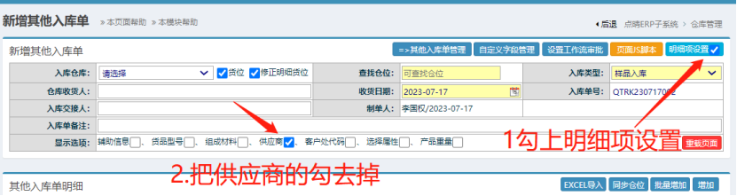 ![]() ![]() 情況描述:新增其他入庫點(diǎn)擊提交時(shí)彈出提示:控件supplier name0帶*或黃色背景位置為必填項(xiàng),不能為空! 如下圖: ![]() 原因:因?yàn)楣瓷厦骷?xì)選項(xiàng),供應(yīng)商那一欄為空了,所以彈出提示。 如下圖: ![]() 解決方法1:填選上供應(yīng)商信息即可。 解決方法2:若是成品入庫不需要填供應(yīng)商,則才明細(xì)選項(xiàng)的供應(yīng)商那一欄勾去掉,然后重新進(jìn)入即可。(記住去掉勾后要重新進(jìn)入) 如下圖: ![]() 點(diǎn)晴模切ERP更多信息:http://moqie.clicksun.cn,聯(lián)系電話:4001861886 該文章在 2023/7/17 16:15:02 編輯過 |
