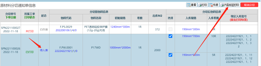 2. 找到分切規(guī)格錯誤要取消分切的分切單,勾上標(biāo)簽然后打印(然后關(guān)閉新頁面)