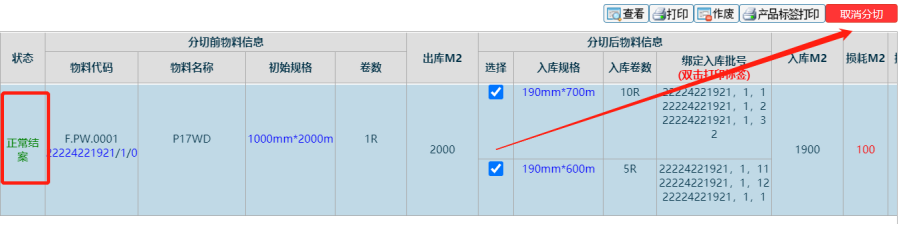 4. 將這些分切出來的物料入庫后,該分切單狀態(tài)變已結(jié)案,此時勾上后再取消分切