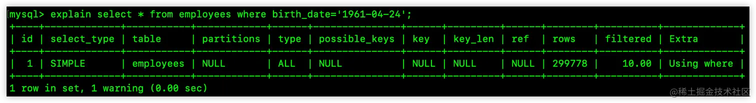 3. 返回需要的列查詢的時(shí)候盡量避免 特別是有的時(shí)候多表聯(lián)合查詢,如果用 在前面的文章中,松哥也和大家提到過(guò)覆蓋索引,如果索引設(shè)計(jì)得當(dāng),那么在查詢的時(shí)候可以通過(guò)覆蓋索引來(lái)提高查詢的性能,但是如果使用了 4. 恰到好處的緩存這里舉一個(gè) TienChin 項(xiàng)目的例子,用戶登錄成功之后,在后續(xù)的流程中,經(jīng)常會(huì)用到當(dāng)前登錄用戶的信息,如果每次都去數(shù)據(jù)庫(kù)查詢,每次查詢返回結(jié)果都是一致的,沒(méi)有必要,此時(shí)我們可以將用戶信息存入到 Redis 緩存中,需要的時(shí)候從 Redis 中提取就可以了。 在項(xiàng)目中,對(duì)于這些需要多次頻繁查詢,且每次查詢返回結(jié)果一樣的數(shù)據(jù),都可以選擇將之存入到緩存中以提高查詢性能。 5. 關(guān)注掃描行數(shù)在查詢的時(shí)候,我們可以通過(guò) explain 來(lái)查看執(zhí)行計(jì)劃,執(zhí)行計(jì)劃中有一個(gè)指標(biāo)是掃描行數(shù),如下圖中的 rows,這個(gè)就表示查詢優(yōu)化器預(yù)估要掃描多少行記錄,filtered 則表示預(yù)估滿足條件的比例。