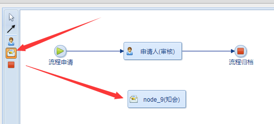 工作流管理-流程設(shè)計(jì)中,先點(diǎn)擊左側(cè)菜單的知會(huì)圖標(biāo),然后點(diǎn)擊流程圖區(qū)域即可插入知會(huì)節(jié)點(diǎn):