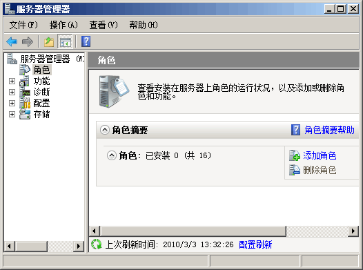1.打開"控制面板→管理工具→服務(wù)器管理器",選擇"角色",在右邊點(diǎn)擊"添加角色":