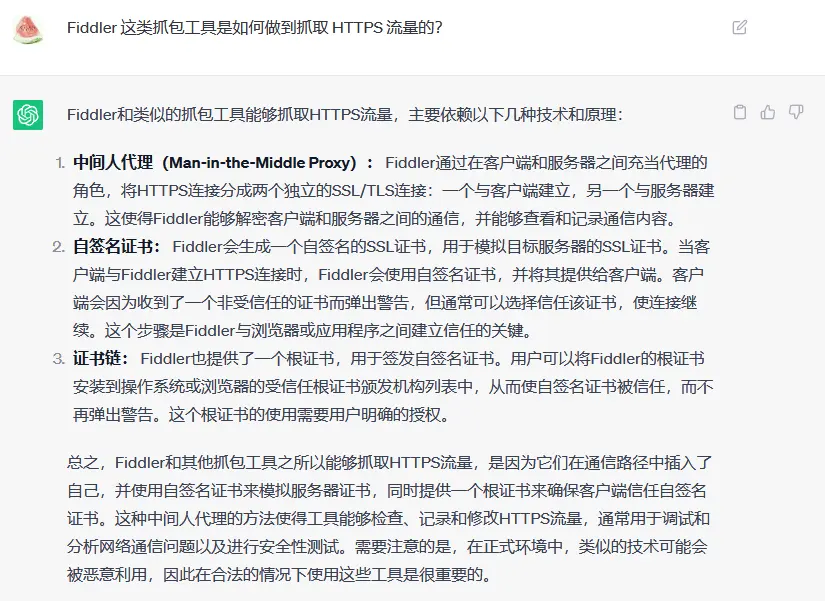 :攔截請求的那些軟件,例如Fiddler,是怎么解碼https內(nèi)容的?![]() 不用去關(guān)心這些解密/加密的過程,因?yàn)?Fiddler 自始至終就沒有參與 “破解” 你的會話(請求),而是 Fiddler “冒充” 了,你與服務(wù)端進(jìn)行通信,同時(shí)在服務(wù)端的視角里,F(xiàn)iddler “冒充”了你,這就是常說的 中間人攻擊(MITM)。 當(dāng)你使用 Fiddler 時(shí),必須要設(shè)置一個(gè)由 Fiddler 創(chuàng)建的代理,安裝一個(gè)證書(對于 HTTPS 而言)。 這個(gè)代理的作用毋庸置疑就是用 Fiddler 來轉(zhuǎn)發(fā)你的流量。但是證書就不一樣了,F(xiàn)iddler 為自己簽發(fā)了一張根證書,并且引導(dǎo)你安裝到了你的電腦中,現(xiàn)在 Fiddler ,就可以冒充成任意一個(gè)服務(wù)端(域名、甚至是 IP)。 現(xiàn)在當(dāng)你發(fā)起一個(gè)請求時(shí),實(shí)際上是你在請求 Fiddler。因?yàn)槟惆惭b了 Fiddler 簽發(fā)的證書,所以 Fiddler 可以獲取并解密你的請求。 然后 Fiddler 再把自己偽裝成你,把你發(fā)送的參數(shù)再發(fā)給真正的服務(wù)端,這時(shí)候你可以把 Fiddler 就看成一個(gè)簡單的 cURL 或者 Postman 都可以,他們只是一個(gè)請求的工具,他自然可以拿到響應(yīng),然后再順帶把響應(yīng)發(fā)給你就行。 而確保 HTTPS 安全最重要的一環(huán)就是本地信任的根證書,不要輕易導(dǎo)入不被信任的根證書,因?yàn)樗梢悦俺淙魏稳?/strong>。 當(dāng)然,也有預(yù)防手段,比如 SSL Pinning,但是瀏覽器內(nèi)的網(wǎng)頁不能使用,一般用于 App 中。 擴(kuò)展閱讀: 最后補(bǔ)充一個(gè)來自 ChatGPT 的解釋吧。