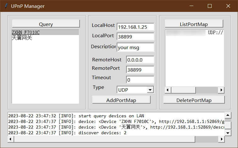 本項(xiàng)目非常簡(jiǎn)單,開(kāi)源供大家交流編程技術(shù) 項(xiàng)目地址:https://github.com/6769/UpnpTool/ Writen by Python 3.10, Running OS>= Windows 8 該文章在 2023/8/31 19:02:26 編輯過(guò) |