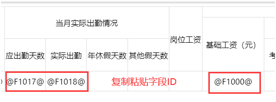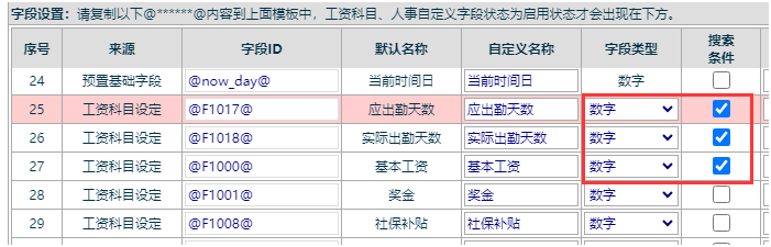 在字段下方設(shè)置中找到需要的字段,調(diào)整字段類型,勾選啟用搜索條件,復(fù)制字段ID@***@到模板中,字段ID表示數(shù)據(jù)信息顯示的位置,excel導(dǎo)入的數(shù)據(jù)也會保存在該字段內(nèi)。