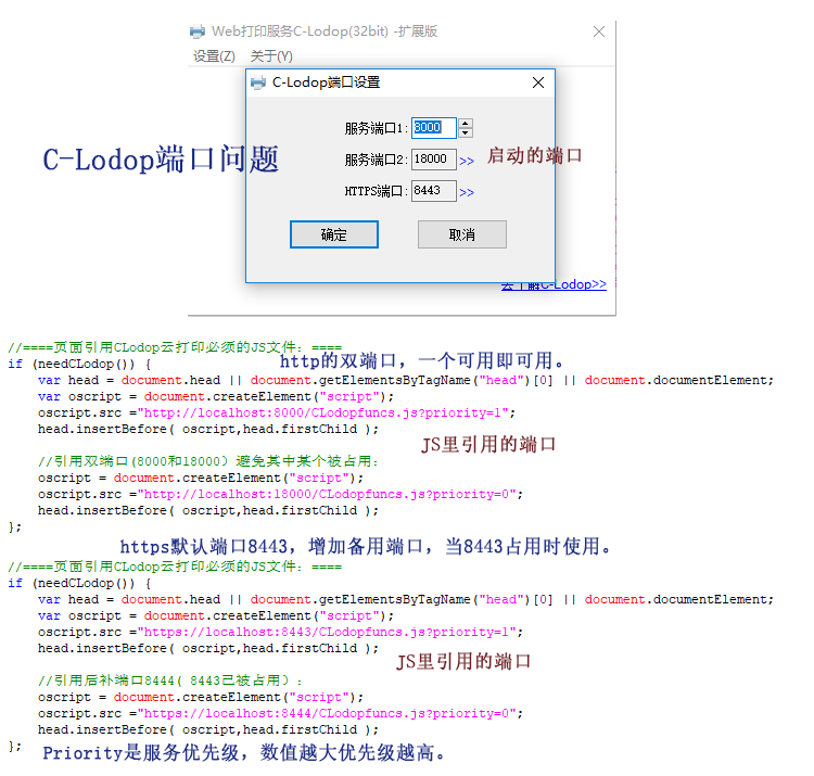 C-Lodop32位擴(kuò)展版支持三個端口,在標(biāo)準(zhǔn)版基礎(chǔ)上,增加了一個8443端口(https),如果該https端口被占用,會加一變成8444端口。