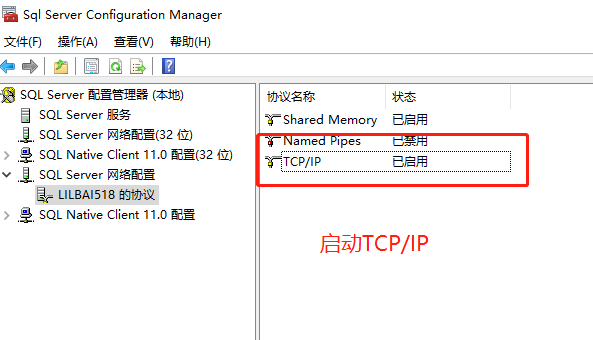 2、打開SQL Server網(wǎng)絡配置,選擇***的協(xié)議,把TCP/IP啟動: