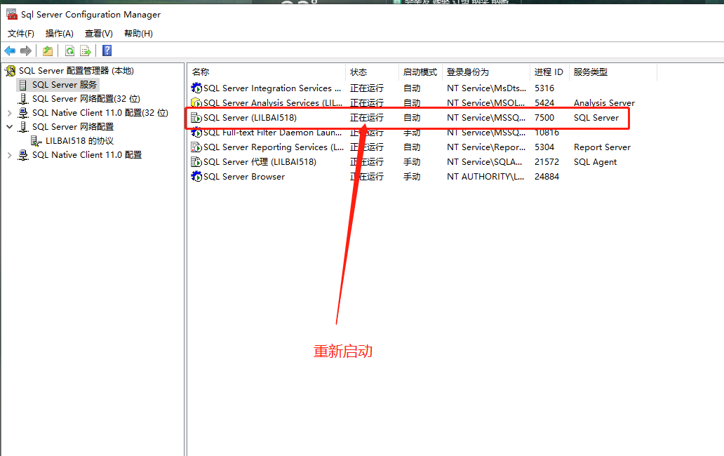 5、返回打開SQL Server服務,找到SQL Server(你電腦名字),后面的服務類型是 SQL Server。右鍵重新啟動: