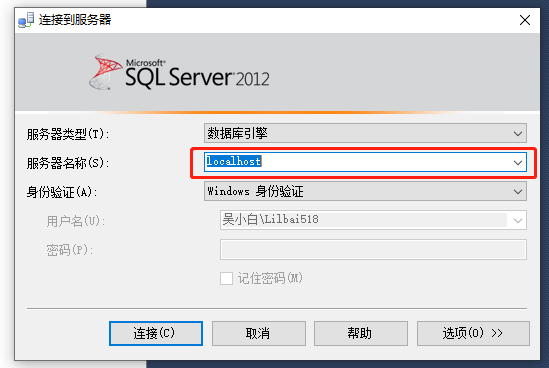 6、最后關閉SQL Server2012,重新進入,這時候成功進入了。如果服務器名稱沒有的話,自己輸入一下localhost,身份驗證選擇window身份驗證: