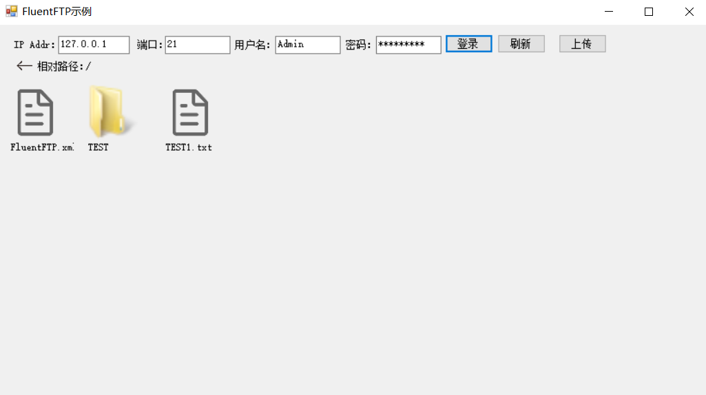 示例源碼FtpHelper類源碼,封裝了FTP文件的檢索,上傳,下載等功能,如下所示: 每一個(gè)FTP文件或文件夾,由一個(gè)自定義用戶控件【PictureBox+Label+ContextMenu】表示,這樣便于處理與顯示: 主頁面由一系列用戶操作框和按鈕組成,完成對FTP的基本操作,如下所示: 該文章在 2025/4/30 9:41:19 編輯過 |