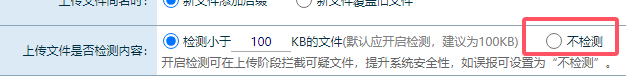 因為圖片中含有代碼,系統(tǒng)認為是風(fēng)險文件,禁止上傳并加入黑名單。 使用加密圖片工具可能會導(dǎo)致該問題,取消加密圖片即可。 也可以修改系統(tǒng)設(shè)置,進入網(wǎng)盤-參數(shù)設(shè)置,選擇 不檢測: 該文章在 2024/11/27 14:51:31 編輯過 |