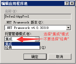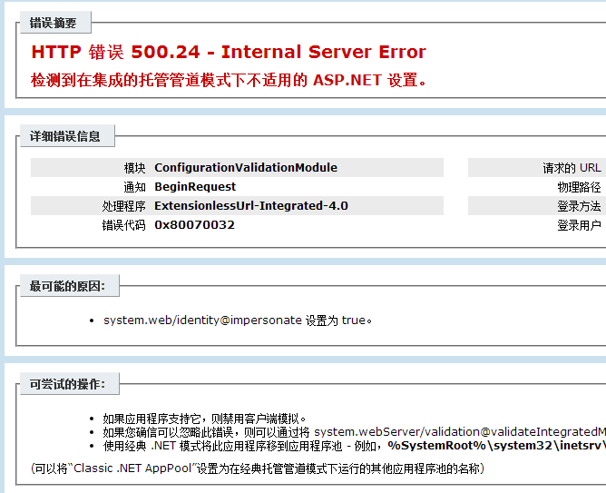 ![]() 然后在應(yīng)用程序池中,找到這個名稱的應(yīng)用程序池,分別將.NET Framework版本設(shè)置為v4.0、托管管道模式設(shè)置為“集成”: ![]() ![]() 注意,如果使用單位的OA服務(wù)器是先安裝IIS、后升級的.NET Framework,那么上述位置的“托管管道模式”設(shè)置為“集成”模式的話,可能會報下圖中各種錯誤,按照教程設(shè)置一下即可恢復(fù)正常: