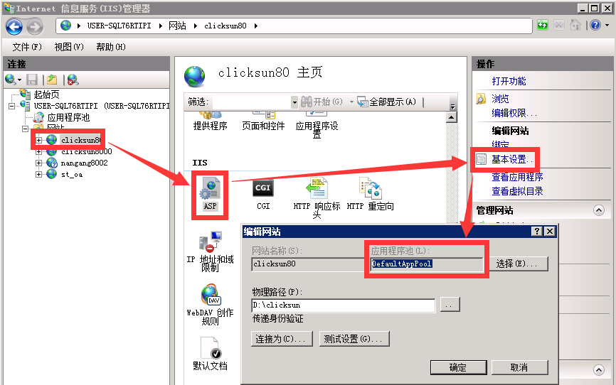 ![]() 然后檢查OA服務(wù)器上點晴OA安裝目錄下IIS配置文件:Web.config 中的數(shù)據(jù)庫訪問用戶名及密碼與配置文件:global.asa 中的是否一致,這兩個配置文件都在點晴OA的安裝目錄下,正常情況下一定在:D:\clicksun\ 下面,不在其他位置: