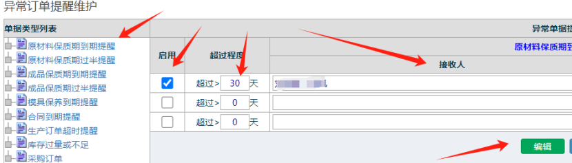 點(diǎn)擊原材料保質(zhì)期,然后勾上啟用,設(shè)置天數(shù),接收人,最后點(diǎn)擊編輯 如下圖: 點(diǎn)晴模切ERP更多信息:http://moqie.clicksun.cn,聯(lián)系電話:4001861886 該文章在 2023/11/28 9:20:10 編輯過 |