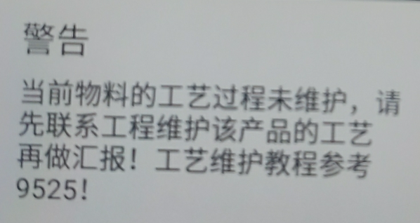 點(diǎn)晴模切ERP-彈出提示:當(dāng)前物料的工藝過程未維護(hù),請(qǐng)先聯(lián)系工程維護(hù)該產(chǎn)品的工藝再做匯報(bào)