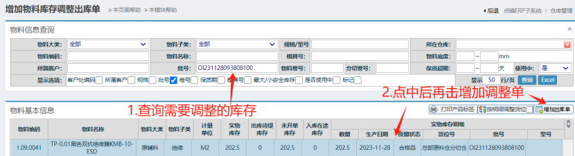 ![]() ![]() 點擊進入 如下圖: ![]() 查詢需要調(diào)整的庫存,可按批號,物料代碼來查詢,然后點中一條再擊增加出庫單。 如下圖: ![]() 如果是卷料直接點擊提交,非卷料可調(diào)整出庫一部分,填寫出庫數(shù)量再點提交。 如下圖: ![]() 點晴模切ERP更多信息:http://moqie.clicksun.cn,聯(lián)系電話:4001861886 該文章在 2025/9/26 10:49:12 編輯過 |