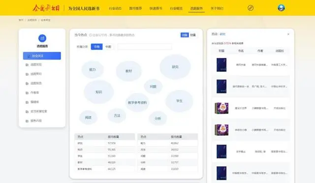 ![]() 全國新書目平臺(https://cnpub.com.cn/)就是當前綜合品質(zhì)較高的專業(yè)平臺,它更是集書目信息檢索展示、數(shù)據(jù)深度挖掘分析、圖書智能推薦、期刊雜志訂購等服務(wù)內(nèi)容于一體的綜合性書目數(shù)據(jù)服務(wù)平臺。憑借平臺具備的多種優(yōu)勢,全國新書目平臺獲得了不少企業(yè)的青睞。僅僅從功能性來看,全國新書目平臺可以分為行業(yè)動態(tài)、圖書推薦、快速查書、行業(yè)概覽、選題服務(wù)等等幾大版塊,分別從不同的方向為用戶提供便利。今天就要帶大家看一下出版行業(yè)比較關(guān)注的選題服務(wù)版塊,感受如何根據(jù)版塊功能為用戶提供有效服務(wù)。