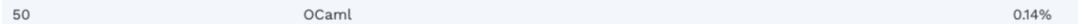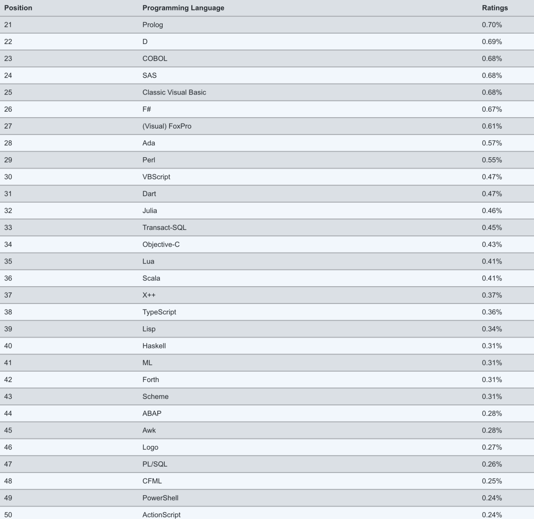 對于這些主流編程語言丟失的市場份額到底去哪里了?TIOBE 官方解釋道,可以在 TIOBE Top 50 末端找到一些答案。很多小眾語言如我們較為熟知的 Dart、Julia、PowerShell、Typescript 等市場份額均有所上升,并且越來越接近主流語言。為了說明這一點,TIOBE 做了一個對比:一年前,排在第 50 名的 OCaml 語言的得分是 0.14%。當(dāng)前的第 50 名 Actionscript 語言的得分是 0.24%。
