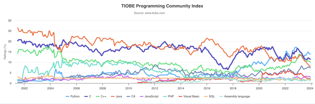 Top 10 編程語言 TIOBE 指數(shù)走勢(2002-2023)