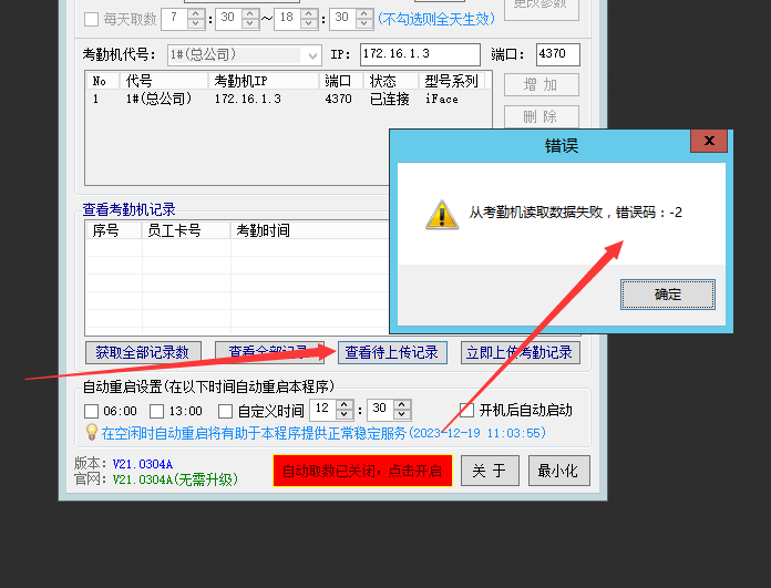 [點晴永久免費OA]取數(shù)時提示錯誤:從考勤機(jī)讀取數(shù)據(jù)失敗,錯誤:-2是什么意思?