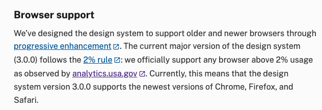 根據(jù) analytics.usa.gov 網(wǎng)站數(shù)據(jù)顯示,政府網(wǎng)站只支持任何使用率超過 2% 的瀏覽器。