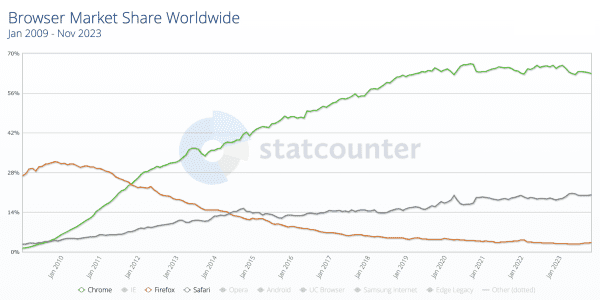 Chrome vs. Firefox vs. Safari ,從 2009 年 1 月到 2023 年 11 月