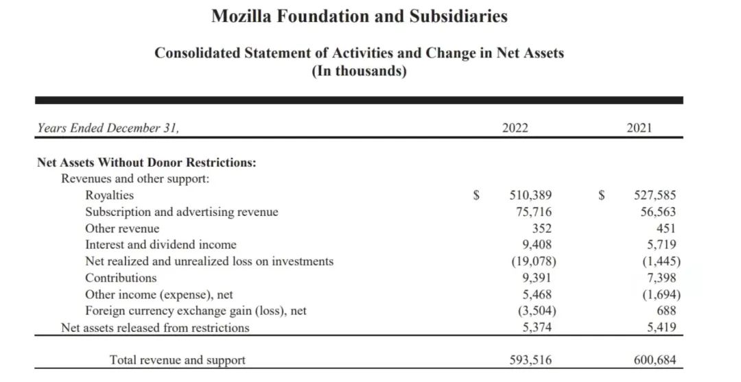與此同時,F(xiàn)irefox 背后的開發(fā)商 Mozilla 在本周也公布了 2022 年的財務(wù)審計報表。Mozilla 2022 年的總收入為 5.93 億美元,比 2021 年少 600 萬美元。