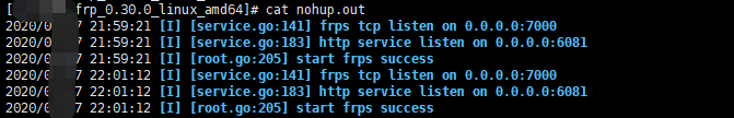bind_port為服務(wù)端和客戶端通信的端口,兩邊保持一致即可。 2)使用nohup ./frps -c frps.ini &命令可后臺運(yùn)行frps服務(wù)端程序,前臺運(yùn)行直接敲./frps -c frps.ini,采用后臺運(yùn)行時,frps的運(yùn)行日志都在當(dāng)前目錄下的nohup.out文件中,可cat查看。