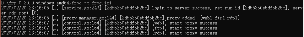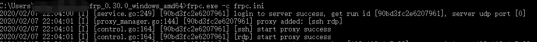 server_addr為公網(wǎng)服務(wù)器的ip地址,server_port為前面服務(wù)器端相同的端口號,[rdp]為反向代理名稱,type為協(xié)議類型(rdp是tcp的),local_ip為內(nèi)網(wǎng)客戶端ip地址,local_port為內(nèi)網(wǎng)客戶端端口(rdp默認(rèn)是3389),remote_port為公網(wǎng)服務(wù)器端的映射端口(也是連接公網(wǎng)ip時要填的端口)。 2)使用frpc.exe -c frpc.ini命令啟動客戶端進(jìn)程,并同步顯示連接和控制信息: