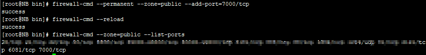 # firewall-cmd --permanent --zone=public --add-port=7000/tcp 添加7000端口到白名單,permanent參數(shù)表示永久,為了重啟后依然生效 # firewall-cmd --reload 重新加載防火墻 # firewall-cmd --zone=public --list-ports 查看白名單 OK了