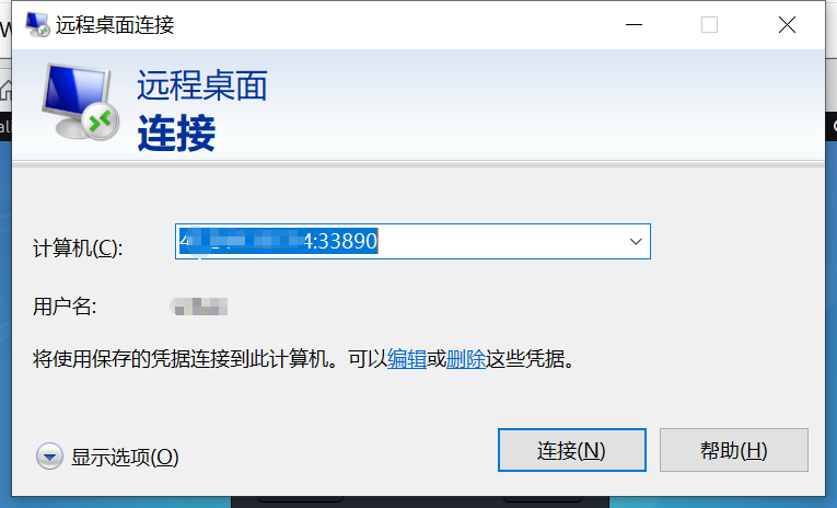 4、測試RDP使用另一臺電腦打開遠(yuǎn)程桌面mstsc,輸入公網(wǎng)ip:映射端口(如111.111.111.111:33890)后確定并輸入客戶端系統(tǒng)的賬號和口令登錄成功。