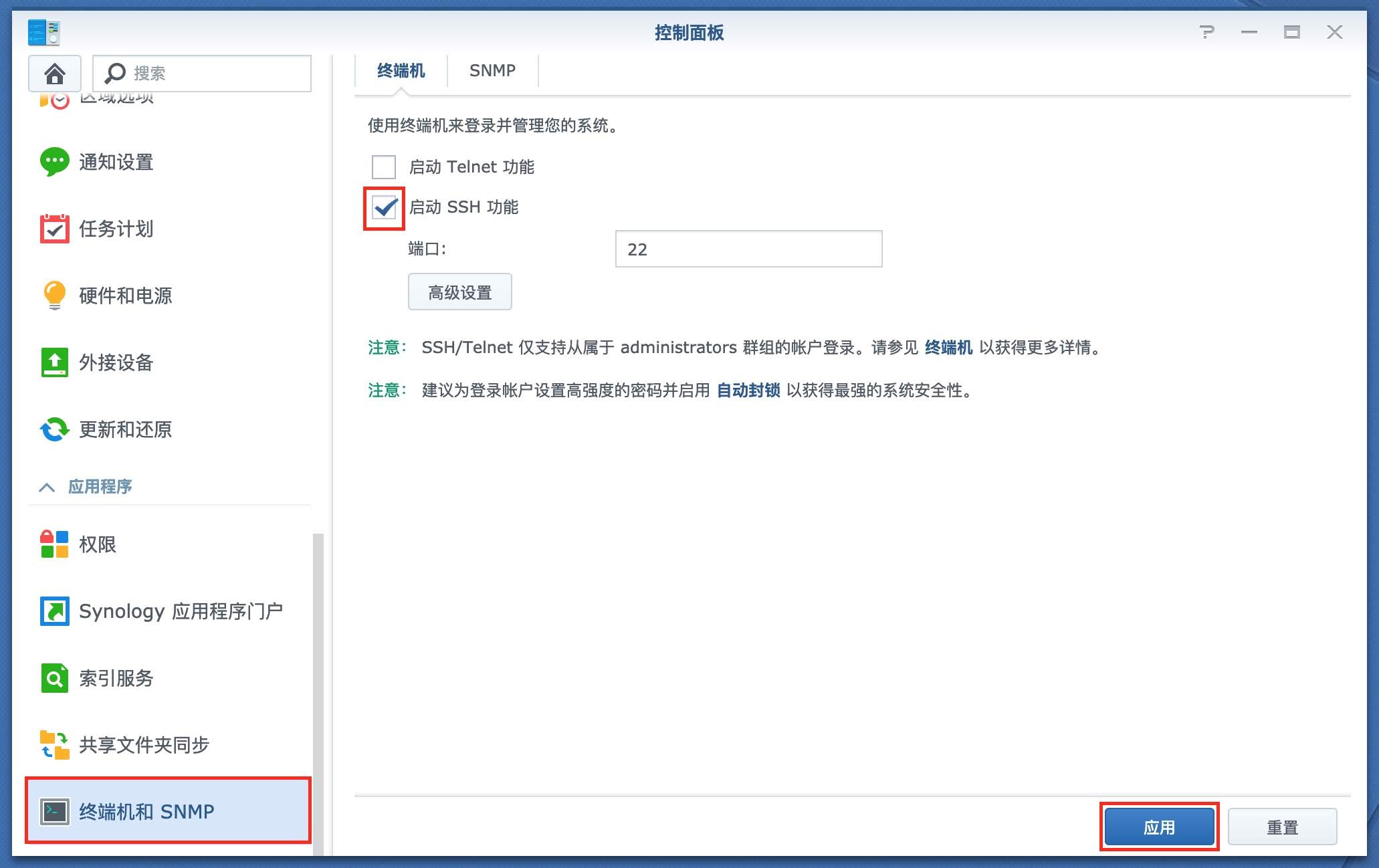 本文為 Stille原創(chuàng)文章.經(jīng)實(shí)踐,測(cè)試,整理發(fā)布.如需轉(zhuǎn)載請(qǐng)聯(lián)系作者獲得授權(quán),并注明轉(zhuǎn)載地址. 群暉NAS docker 安裝如果你的群暉能夠安裝docker,請(qǐng)忽略本文,優(yōu)先參考群暉NAS使用Docker安裝配置frpc內(nèi)網(wǎng)穿透教程來配置更加方便快速. 群暉NAS 一鍵腳本安裝 博主根據(jù)手動(dòng)安裝 frpc 的方式簡(jiǎn)單制作了針對(duì) 設(shè)置域名解析登錄你的域名服務(wù)商 開啟群暉SSH功能并登陸控制面板-終端機(jī)和SNMP 打開終端并ssh登陸到群暉 ssh xxxx@192.168.x.x # xxx為群暉管理員賬號(hào),IP為群暉內(nèi)網(wǎng)IP.輸入群暉登陸密碼 - 回車. sudo -i # 獲得root權(quán)限.輸入群暉登陸密碼 - 回車. 一鍵安裝卸載腳本安裝wget https://raw.githubusercontent.com/stilleshan/frpc/master/frpc_synology_install.sh && chmod +x frpc_synology_install.sh && ./frpc_synology_install.sh # 以下為國(guó)內(nèi)鏡像 wget https://github.ioiox.com/stilleshan/frpc/raw/branch/master/frpc_synology_install.sh && chmod +x frpc_synology_install.sh && ./frpc_synology_install.sh 卸載wget https://raw.githubusercontent.com/stilleshan/frpc/master/frpc_synology_uninstall.sh && chmod +x frpc_synology_uninstall.sh && ./frpc_synology_uninstall.sh# 以下為國(guó)內(nèi)鏡像wget https://github.ioiox.com/stilleshan/frpc/raw/branch/master/frpc_synology_uninstall.sh && chmod +x frpc_synology_uninstall.sh && ./frpc_synology_uninstall.sh