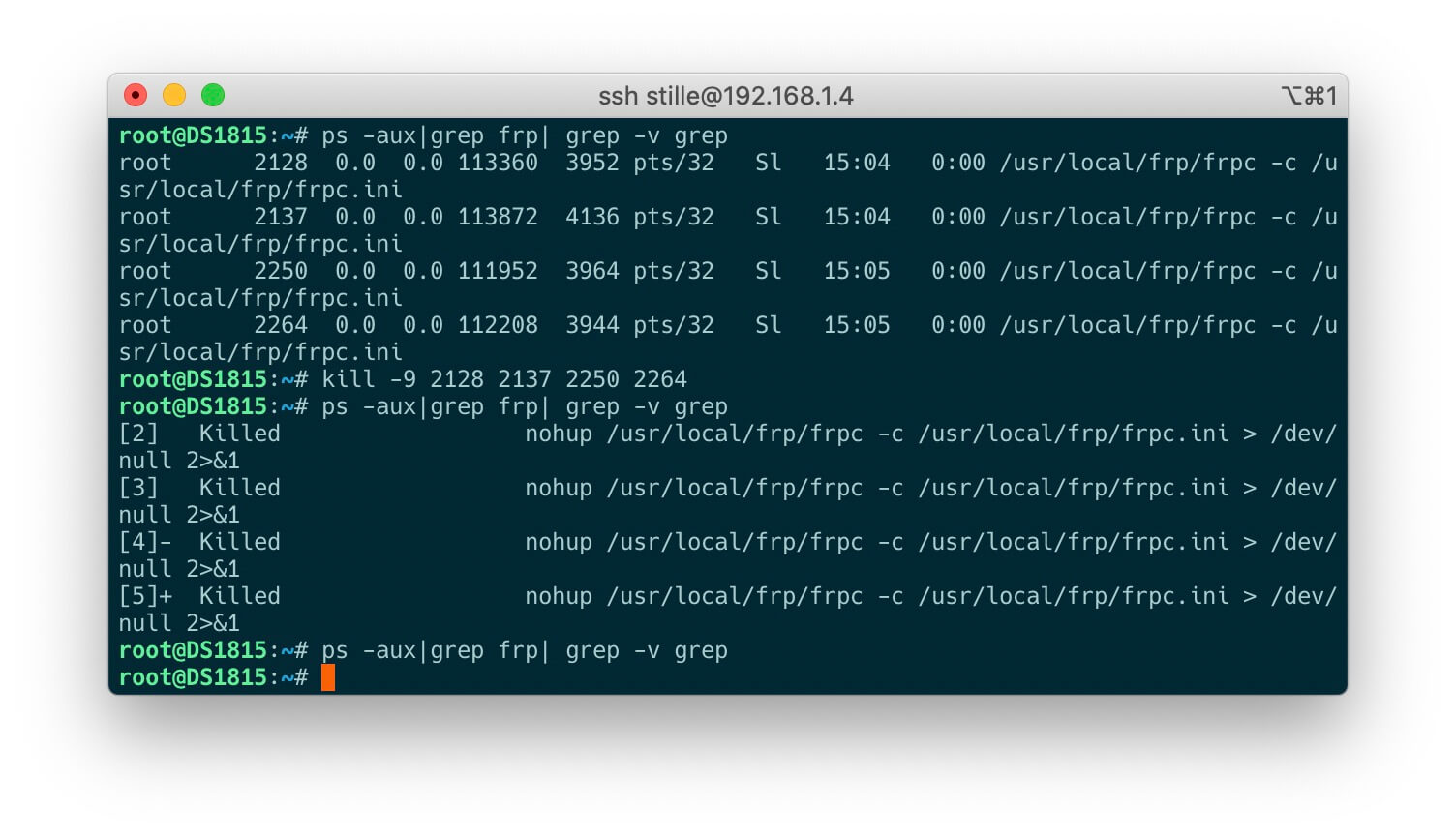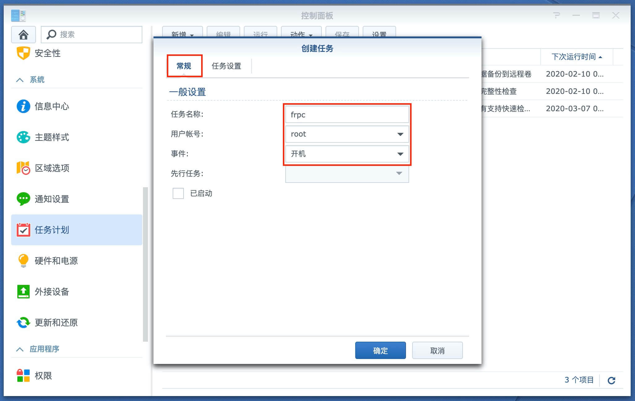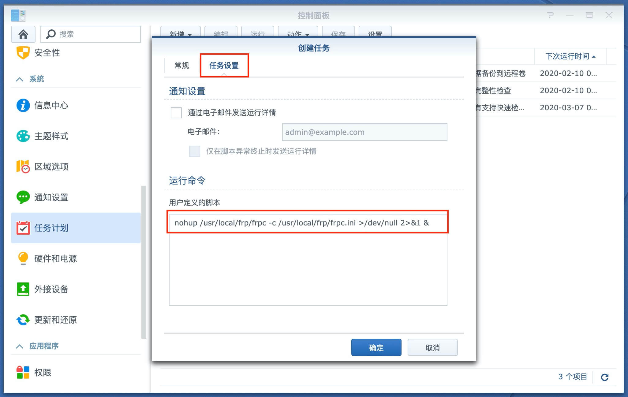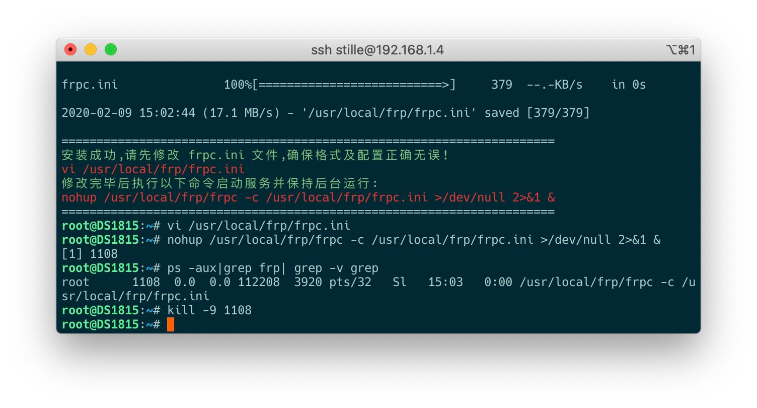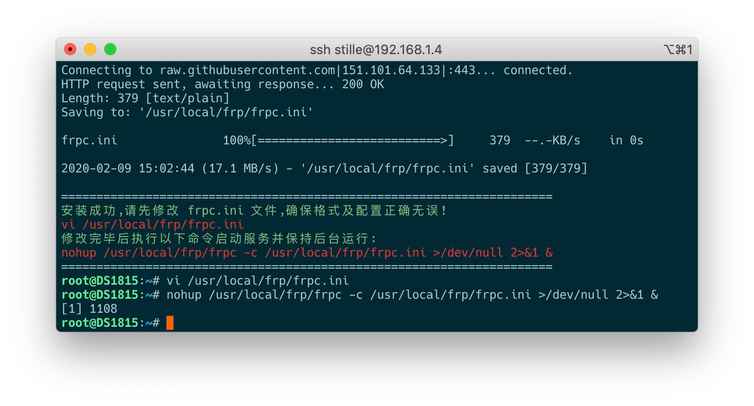 [web2_xxxxxx] # 為避免錯(cuò)誤,一定需更改為比較特殊的名稱,不能和服務(wù)器端其他配置重名. type = https # https協(xié)議 local_ip = 192.168.1.5 # 填寫群暉內(nèi)網(wǎng)IP. local_port = 5001 # 群暉內(nèi)網(wǎng)HTTPS端口,默認(rèn)為5001. custom_domains = nas.ioiox.com # 填寫你的域名 ESC退出編輯 注意 frpc.ini 中不需要以上參照的注釋符號(hào)和注釋,即#和#之后的文字.更多 frpc.ini 的詳解,請(qǐng)參考:新手入門 - 詳解 frp 內(nèi)網(wǎng)穿透 frpc.ini 配置 啟動(dòng)frpc確保 nohup /usr/local/frp/frpc -c /usr/local/frp/frpc.ini >/dev/null 2>&1 & 服務(wù)運(yùn)行時(shí)修改 ps -aux|grep frp| grep -v grep # 查詢 frpc 的運(yùn)行進(jìn)程ID,并 kill 停止服務(wù). kill -9 1108 如因誤操作等原因出現(xiàn)多個(gè)進(jìn)程,可能會(huì)導(dǎo)致 frpc 無法使用正確的 frpc.ini 配置,需全部停止,再次啟動(dòng)即可。 設(shè)置群暉NAS開機(jī)啟動(dòng)frpc常規(guī) 任務(wù)設(shè)置 nohup /usr/local/frp/frpc -c /usr/local/frp/frpc.ini >/dev/null 2>&1 & 配置完成現(xiàn)在可以使用域名無端口訪問群暉NAS了 結(jié)語(yǔ)關(guān)于frpc客戶端的安裝方法總結(jié)以下幾種方式: 群暉 docker 安裝 - 群暉NAS使用Docker安裝配置frpc內(nèi)網(wǎng)穿透教程 內(nèi)網(wǎng) Linux 服務(wù)器或虛擬機(jī) 一鍵腳本安裝 - 參考我的GitHub項(xiàng)目 stilleshan/frpc 內(nèi)網(wǎng) Linux 服務(wù)器 docker 安裝 - 參考我的GitHub項(xiàng)目 stilleshan/frpc 更多群暉NAS相關(guān)技巧,教程及信息,請(qǐng)持續(xù)關(guān)注本站群暉Synology專欄: 本文為 Stille原創(chuàng)文章,經(jīng)實(shí)踐、測(cè)試、整理發(fā)布,如需轉(zhuǎn)載請(qǐng)聯(lián)系作者獲得授權(quán),并注明轉(zhuǎn)載地址: 該文章在 2024/1/2 18:36:29 編輯過 |