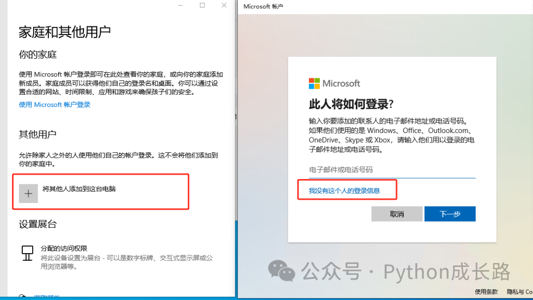 效果![]() 以下的步驟Win10和Win11是一樣的,只需要在被控端設(shè)置,連接的電腦無需設(shè)置。 添加用戶設(shè)置-》家庭與其他用戶-》將其他人添加到這臺電腦-》我沒有這個人的登錄信息: ![]() ![]() 也可以使用Win鍵+R然后輸入