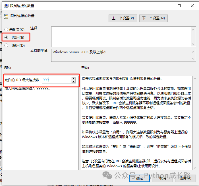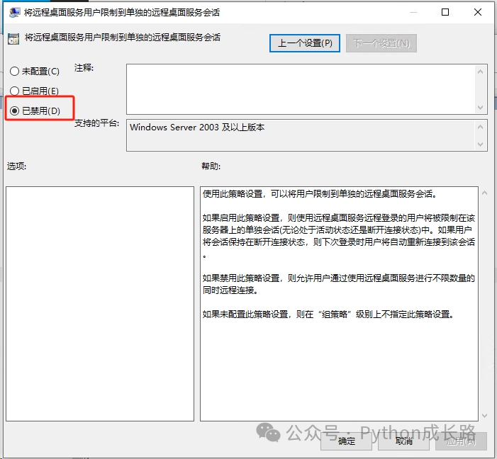 ![]() 計算機配置-管理模板-Windows組件-遠程桌面服務(wù)-遠程桌面會話主機-連接 找到限制連接的數(shù)量和將遠程桌面服務(wù)用戶限制到單獨的遠程桌面服務(wù)會話 ![]() 下面這個設(shè)置是同一個用戶可以登錄多個(沒什么意義,因為進入的桌面環(huán)境不一樣,看不到對方在干嘛) ![]() ![]() 安裝rdpwraphttps://github.com/stascorp/rdpwrap/releases/tag/v1.6.2 選擇zip,msi可能安裝失敗,解壓后運行 下載最新的 接著打開 ![]() 接著打開 ![]() 重啟后就可以同時連接該電腦的多個用戶。 該文章在 2024/1/13 16:40:48 編輯過 |