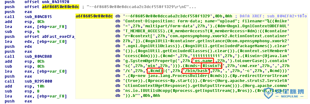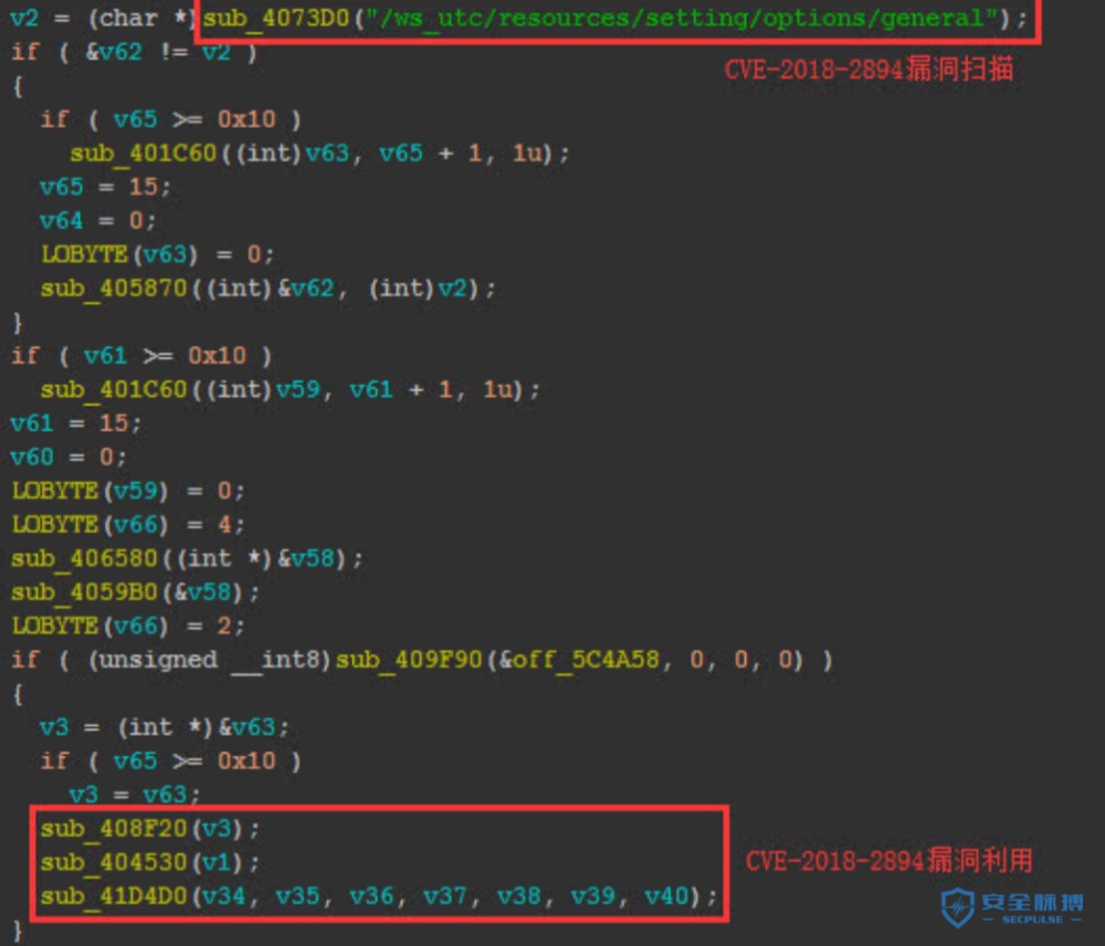 注:上圖GandCrab5.0勒索病毒內(nèi)置的執(zhí)行CVE-2018-8120漏洞的代碼。 Apache Struts2遠(yuǎn)程代碼執(zhí)行漏洞(S2-045) 注:上圖顯示了某款勒索軟件所內(nèi)置的Apache Struts2遠(yuǎn)程代碼執(zhí)行漏洞利用代碼。 Apache Struts2遠(yuǎn)程代碼執(zhí)行漏洞(S2-057) ![]() 注:上圖顯示了某款勒索軟件所內(nèi)置的Apache Struts2遠(yuǎn)程代碼執(zhí)行漏洞利用代碼。