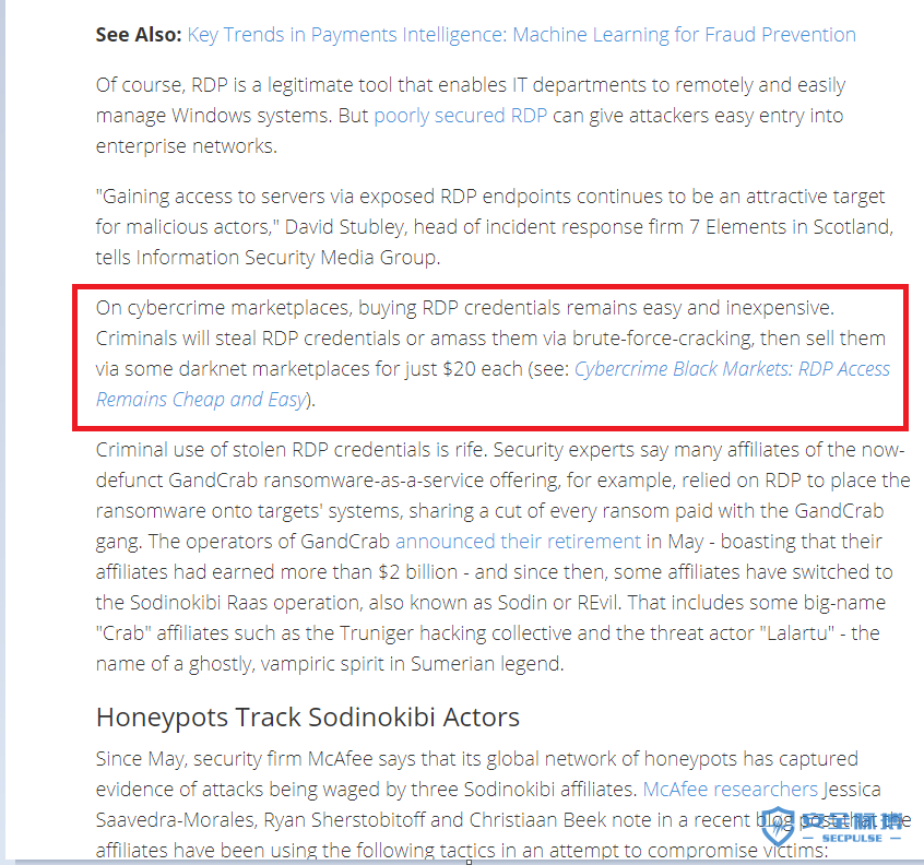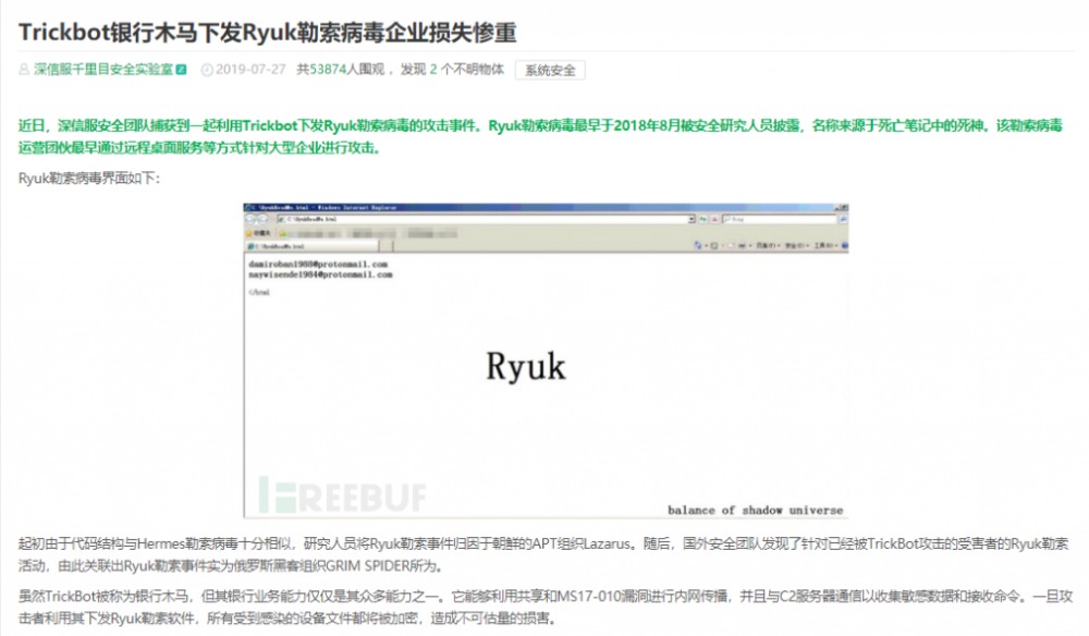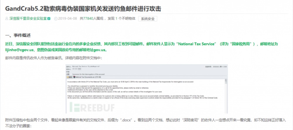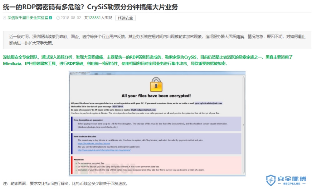 VNC爆破 2019年3月,針對(duì)遠(yuǎn)程管理工具VNC進(jìn)行大范圍掃描探測(cè)被發(fā)現(xiàn),攻擊者使用弱口令字典對(duì)運(yùn)行VNC服務(wù)的機(jī)器進(jìn)行爆破連接。爆破成功后,該團(tuán)伙會(huì)在中招企業(yè)網(wǎng)絡(luò)中運(yùn)行多種病毒木馬,包括GandCrab5.2勒索病毒、門羅幣挖礦木馬、數(shù)字貨幣錢包劫持木馬等均被下載運(yùn)行。 參考鏈接:https://www.freebuf.com/column/198957.html RDP爆破 2018年8月,深信服安全團(tuán)隊(duì)陸續(xù)接到政府、國(guó)企、醫(yī)療等多個(gè)行業(yè)用戶反饋,其業(yè)務(wù)系統(tǒng)在短時(shí)間內(nèi)出現(xiàn)被勒索加密現(xiàn)象,造成服務(wù)器大面積癱瘓,情況危急,原因不明,對(duì)如何遏止影響進(jìn)一步擴(kuò)大束手無(wú)策。深信服安全團(tuán)隊(duì),通過深入追蹤分析,發(fā)現(xiàn)大面積癱瘓,主要是統(tǒng)一的RDP弱密碼造成的,勒索家族為CrySiS,目前仍然是比較活躍的勒索家族之一。黑客主要利用大量黑客工具,進(jìn)行RDP爆破,利用統(tǒng)一密碼特性,使用相同密碼對(duì)全網(wǎng)業(yè)務(wù)進(jìn)行集中攻擊,導(dǎo)致重要數(shù)據(jù)被加密。 ![]() 參考鏈接:https://www.freebuf.com/articles/terminal/179004.html Web管理后臺(tái)弱口令爆破 勒索病毒GandCrab曾多次被爆出通過暴力破解Tomcat Web服務(wù)器弱密碼實(shí)現(xiàn)入侵。例如通過入侵通過Tomcat Manager管理后臺(tái)弱口令進(jìn)行爆破,爆破成功后,攻擊者會(huì)上傳一個(gè)war包,該war包中包含了一個(gè)JSP網(wǎng)頁(yè)木馬,這是一個(gè)擁有最高權(quán)限的WebShell。攻擊一旦得手,黑客就會(huì)以此為跳板,繼續(xù)向內(nèi)網(wǎng)擴(kuò)散。 SMB爆破 SMB是一種非常常用的網(wǎng)絡(luò)共享協(xié)議,基于SMB漏洞的勒索病毒入侵很多,典型的就是WannaCry勒索病毒。其實(shí),SMB爆破也是勒索病毒入侵的一種常見方式。黑客深入內(nèi)網(wǎng)后,常見會(huì)利用攻擊工具(SMB弱口令爆破)在局域網(wǎng)內(nèi)橫向擴(kuò)散。從調(diào)查來看,雖然機(jī)構(gòu)大多都有及時(shí)修復(fù)高危漏洞的意識(shí),但是由于管理不到位,SMB賬號(hào)爆破風(fēng)險(xiǎn)依然存在,給了黑客可乘之機(jī)。 MySQL爆破 2019年9月,深信服安全團(tuán)隊(duì)發(fā)現(xiàn),全國(guó)各地有多處針對(duì)MySQL數(shù)據(jù)庫(kù)的勒索病毒現(xiàn)象發(fā)生,其主要入侵手段是MySQL賬號(hào)密碼爆破,與以往勒索病毒攻擊相差較大的是,表現(xiàn)為不在操作系統(tǒng)層面加密任何文件,而是直接登錄MySQL數(shù)據(jù)庫(kù),在數(shù)據(jù)庫(kù)應(yīng)用里面執(zhí)行加密動(dòng)作。加密行為主要有,遍歷數(shù)據(jù)庫(kù)所有的表,加密表每一條記錄的所有字段,每張表會(huì)被追加_encrypt后綴,并且對(duì)應(yīng)表會(huì)創(chuàng)建對(duì)應(yīng)的勒索信息。 參考鏈接:https://www.freebuf.com/articles/system/213975.html 釣魚郵件 2019年4月,深信服安全團(tuán)隊(duì)接到包括金融行業(yè)在內(nèi)的多家企業(yè)反饋,其內(nèi)部員工收到可疑郵件。郵件發(fā)件人顯示為“National Tax Service”(譯為“國(guó)家稅務(wù)局”),郵箱地址為lijinho@cgov.us,意圖偽裝成美國(guó)政府專用的郵箱地址gov.us。追蹤發(fā)現(xiàn),該郵件為GandCrab5.2勒索病毒的釣魚郵件,用戶如果嘗試打開該郵件附件,就會(huì)中勒索病毒,從而造成不可估量的損失。 ![]() 參考鏈接:https://www.freebuf.com/articles/system/200070.html U盤投毒 2018年12月,奇安信威脅情報(bào)中心就監(jiān)控到GandCrab勒索病毒通過U盤和壓縮文件傳播,一度活躍在包括局域網(wǎng)在內(nèi)的眾多終端上。該蠕蟲病毒構(gòu)成的僵尸網(wǎng)絡(luò),過去主要傳播遠(yuǎn)控、竊密、挖礦等木馬病毒,而現(xiàn)在開始投遞GandCrab勒索病毒。 參考鏈接:https://www.secrss.com/articles/6806 在地下論壇購(gòu)買RDP賬號(hào) 地下論壇一直是黑產(chǎn)的溫床,對(duì)有些黑客來說,并不一定要自己親自去破解用戶賬號(hào)密碼。以勒索病毒為例,很早就爆出,一個(gè)RDP賬號(hào)大概20美元,在地下論壇和市場(chǎng)可以直接購(gòu)買,然后用于勒索病毒攻擊活動(dòng),賺取勒索成功后的巨大差價(jià)。 ![]() 參考鏈接: https://www.bankinfosecurity.com/ransomware-gangs-not-so-secret-attack-vector-rdp-exploits-a-13342 僵尸網(wǎng)絡(luò) 2019年7月,深信服安全團(tuán)隊(duì)捕獲到一起利用Trickbot僵尸網(wǎng)絡(luò)下發(fā)Ryuk勒索病毒的攻擊事件。Ryuk勒索病毒最早于2018年8月被安全研究人員披露,名稱來源于死亡筆記中的死神。該勒索病毒運(yùn)營(yíng)團(tuán)伙最早通過遠(yuǎn)程桌面服務(wù)等方式針對(duì)大型企業(yè)進(jìn)行攻擊。起初由于代碼結(jié)構(gòu)與Hermes勒索病毒十分相似,研究人員將Ryuk勒索事件歸因于朝鮮的APT組織Lazarus。隨后,國(guó)外安全團(tuán)隊(duì)發(fā)現(xiàn)了針對(duì)已經(jīng)被TrickBot攻擊的受害者的Ryuk勒索活動(dòng),由此關(guān)聯(lián)出Ryuk勒索事件實(shí)為俄羅斯黑客組織GRIM SPIDER所為。在這里是想提醒大家,現(xiàn)存的僵尸網(wǎng)絡(luò)是很龐大的,如果后期僵尸網(wǎng)絡(luò)大量被用于勒索攻擊,是一件非??膳碌氖虑?。 ![]() 參考鏈接:https://www.freebuf.com/articles/system/208537.html 破解軟件 由于某方面原因,有不少用戶喜歡用一些破解或者捆綁類軟