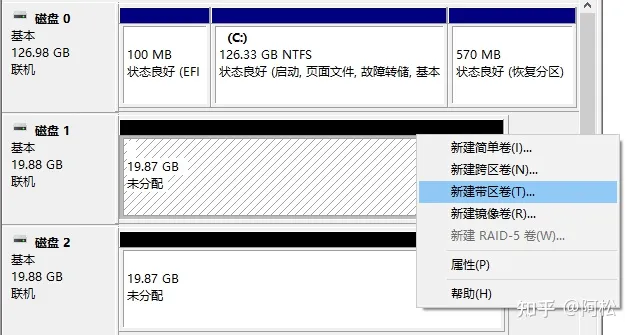 組建RAID 0這里用磁盤1和磁盤2組建RAID 0 選擇磁盤1右鍵【新建帶區(qū)卷】