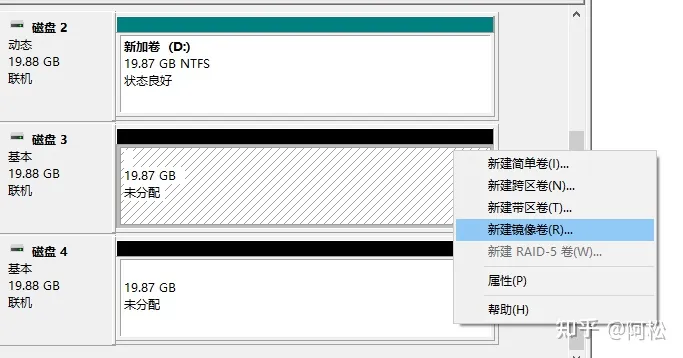 組建RAID 1RAID 1需要兩塊磁盤,這里我使用磁盤3和磁盤4演示操作 選中磁盤3或者磁盤4右鍵,選擇【新建鏡像卷】