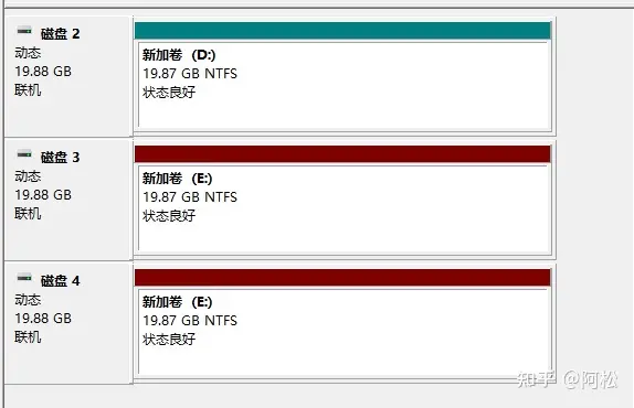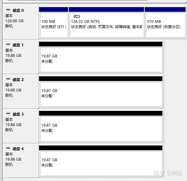 Windows無需陣列卡組建RAID0、RAID1、RAID5方法本次教程通過虛擬機測試 測試環(huán)境:Windows10 測試硬件:五個磁盤,一個系統(tǒng)盤,四個數(shù)據(jù)盤