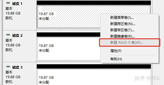 不知道是不是系統(tǒng)的緣故,Windows10上的新建RAID 5是無法選擇的,但是之前我在Windows Server 2012上面測試過是可以直接創(chuàng)建的,方法和上面類似,這里我用另一種方法來演示組建RAID 5