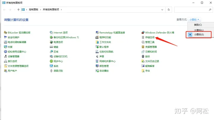 打開控制面板,查看方式改成小圖標,選擇【存儲空間】