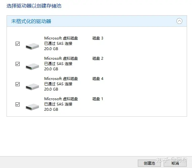 這里至少需要勾選三個驅(qū)動器才能創(chuàng)建RAID 5,我有四個就一起選了,然后創(chuàng)建池