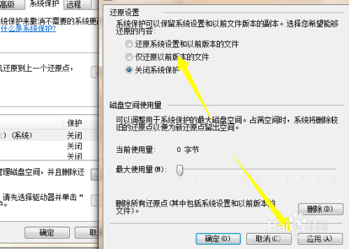 我們點擊關閉上面兩個任一一個選項,點擊下面的應用,這個時候我們的還原點就建立好了。